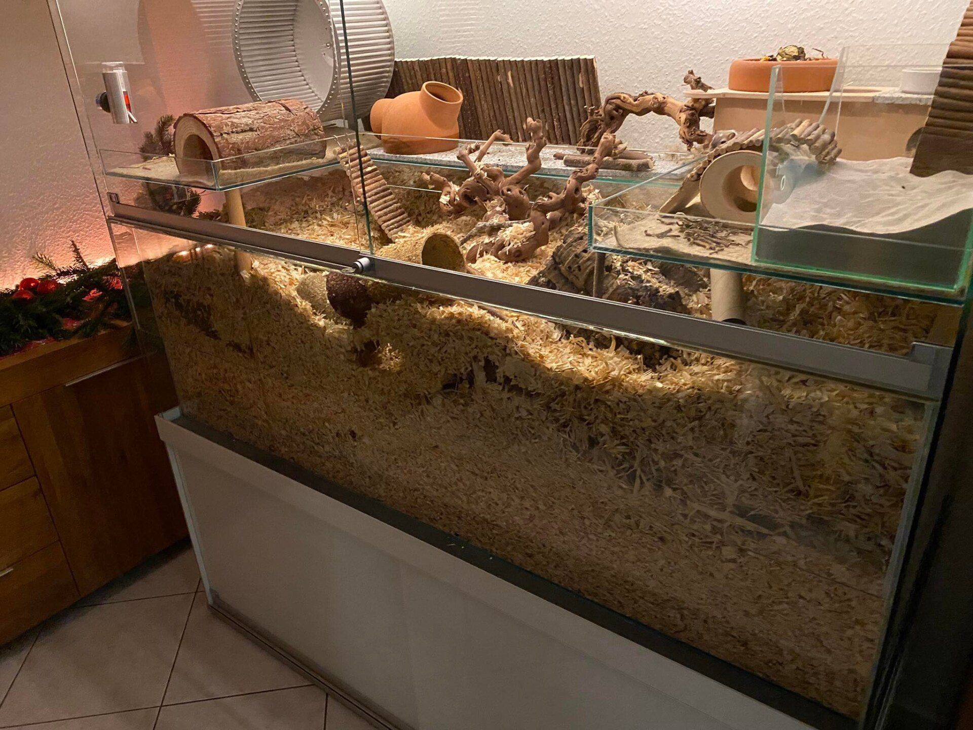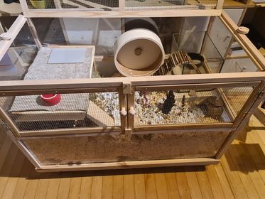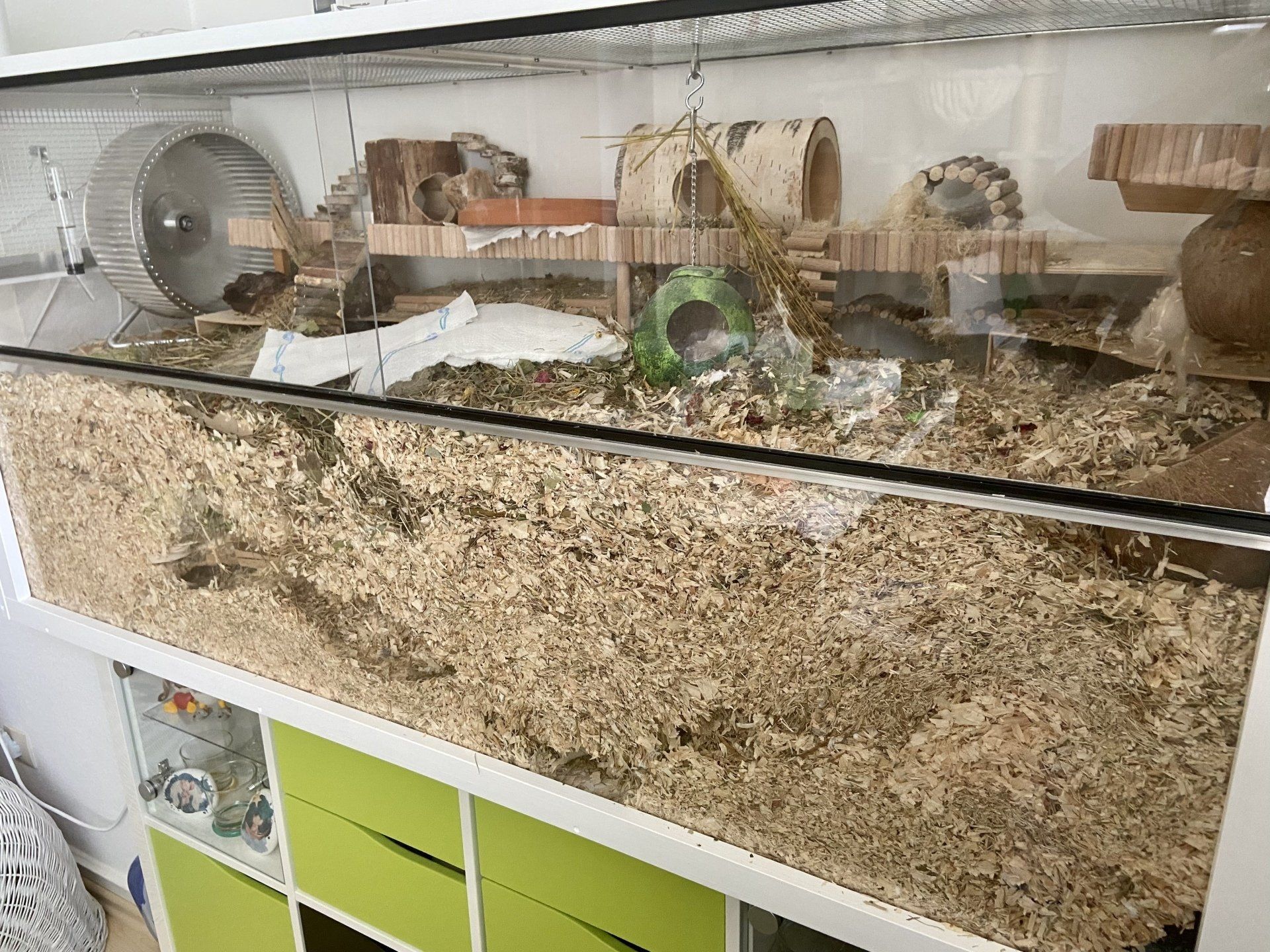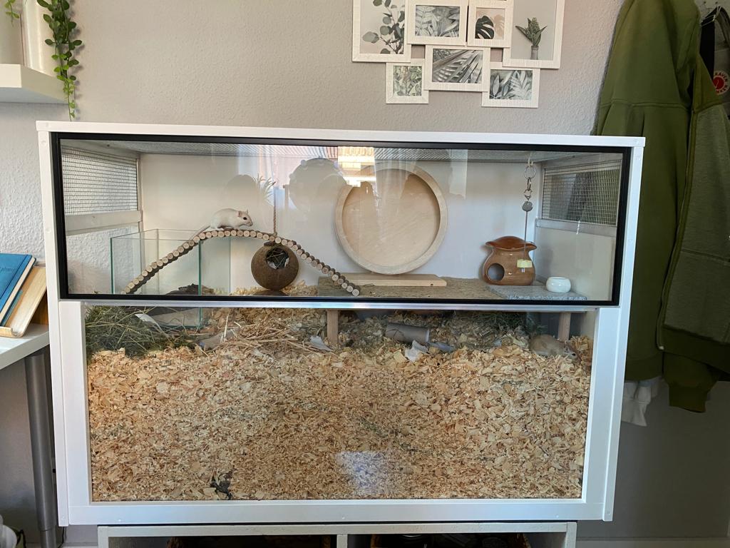 - Schwere Gegenstände, wie Sandbäder, große Häuser, Laufrad und co, sollten Sie auf eine Ebene stellen. Die Mäuse können erdrückt werden, wenn solche Gegenstände unterbuddelt werden.