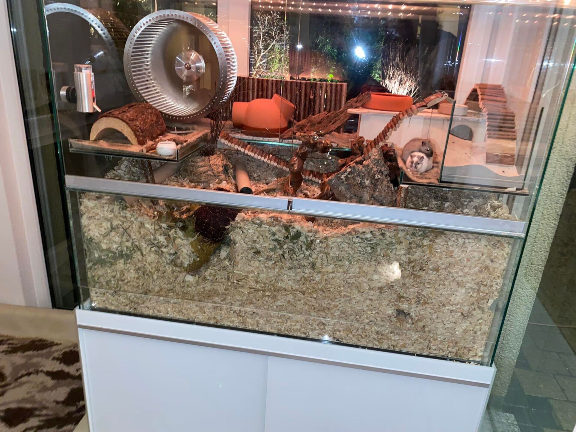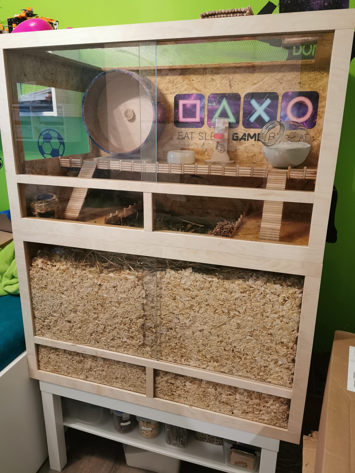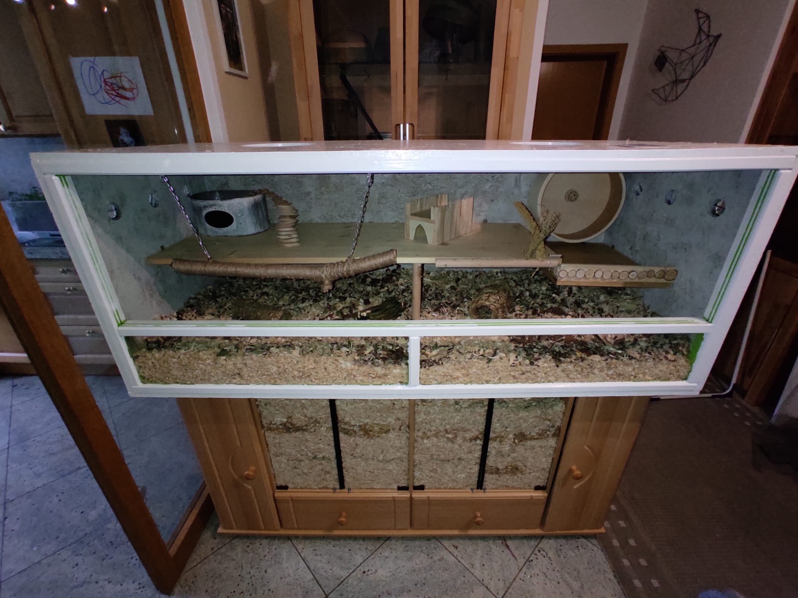 Diese Modelle sind im Handel sehr einfach zu bekommen. Jedoch achten Sie bitte unbedingt auf die Größe, nur 2 Modelle überhaupt erfüllen das gesetzliche Mindestmaß. Wichtig ist auch hier die Ebenen niedrig zu setzen. Direkt über dem Glasrand sorgen sie zb. dafür, dass die Streu auch im Gehege bleibt ;) Das geht z.B. sehr bequem und langlebig mit einer Siebdruckplatte.