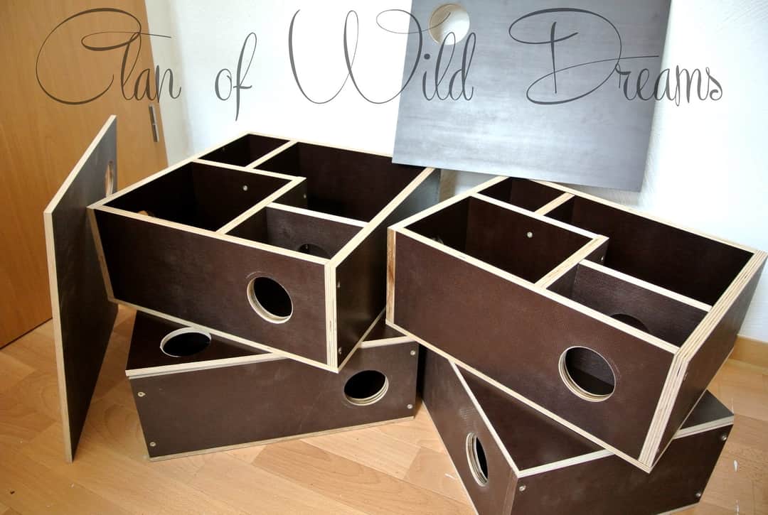 Selbstgebaute Mehrkammernhäuser. Ebenfalls aus Siebdruckplatten mit abnehmbarem Deckel.