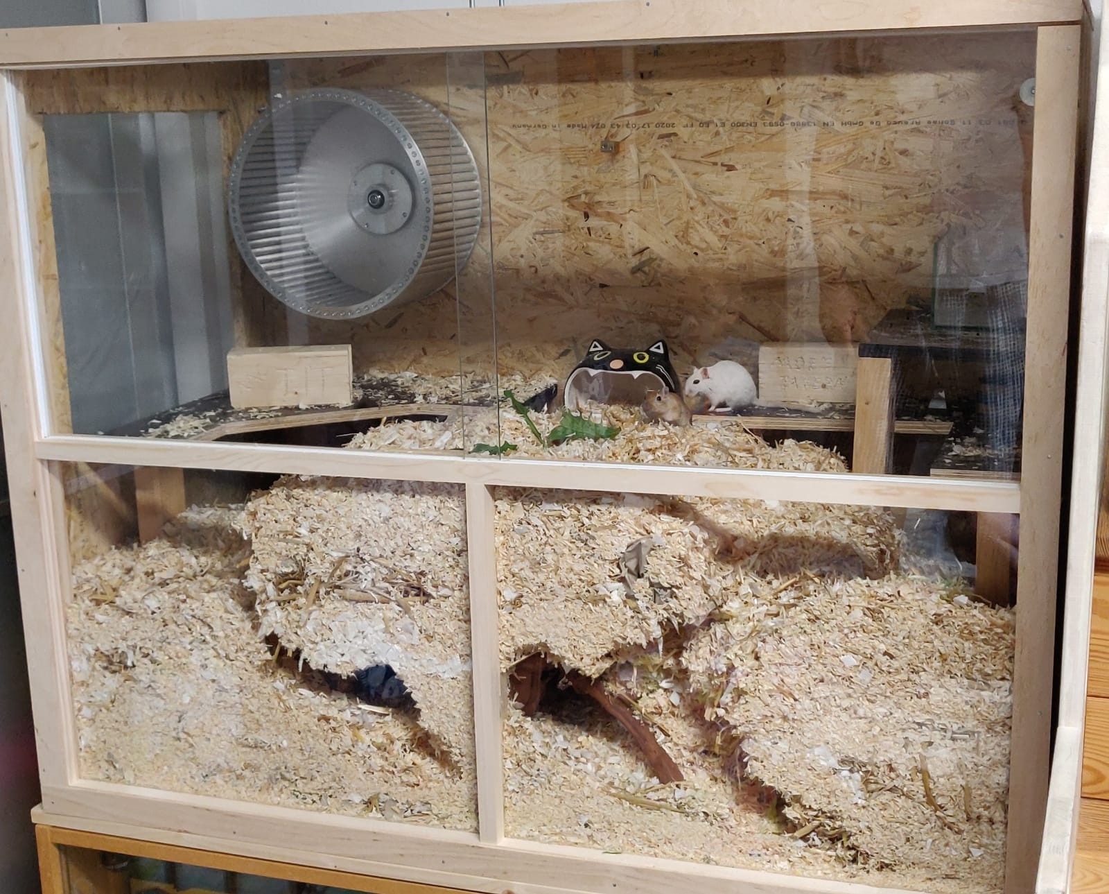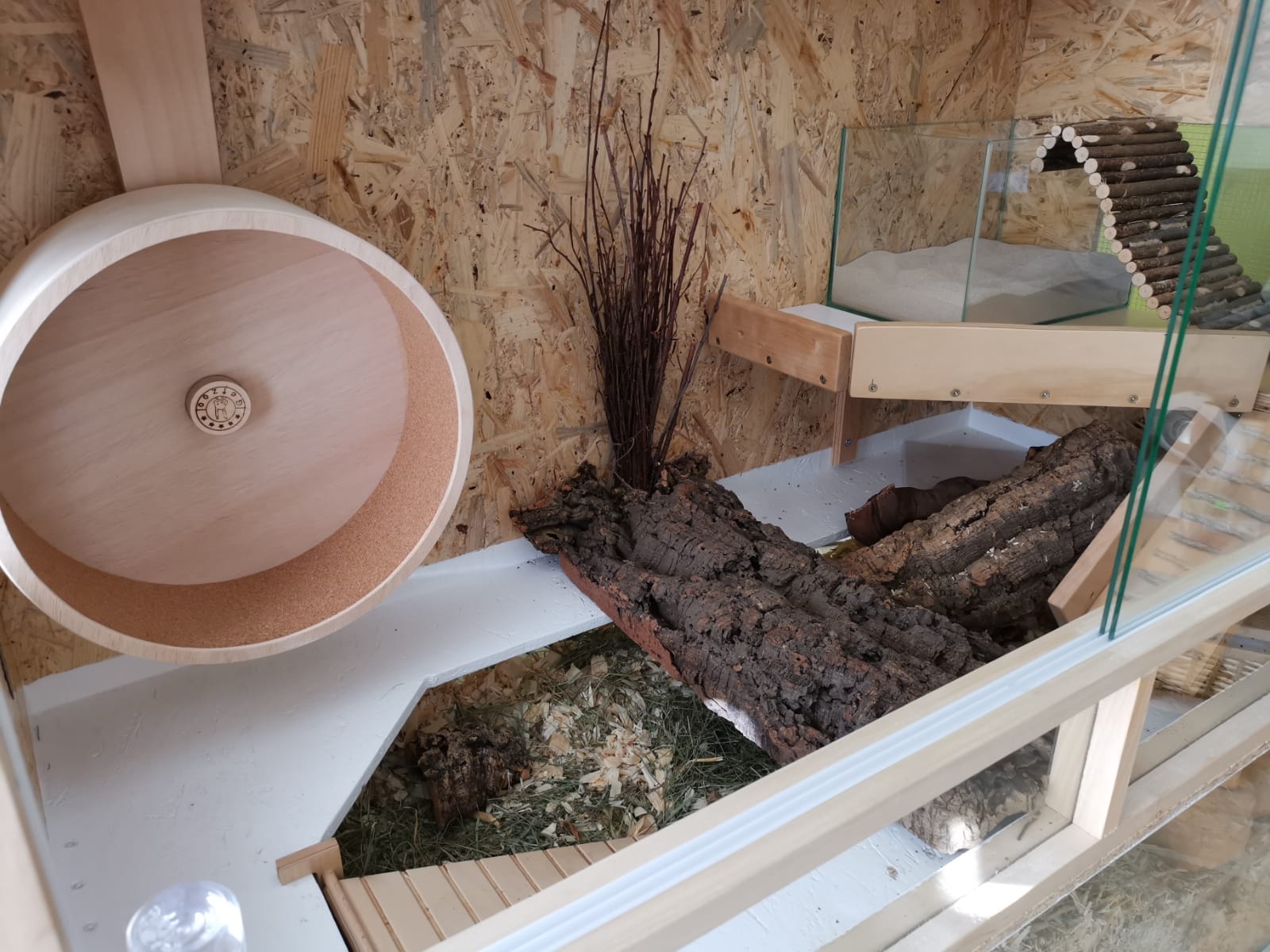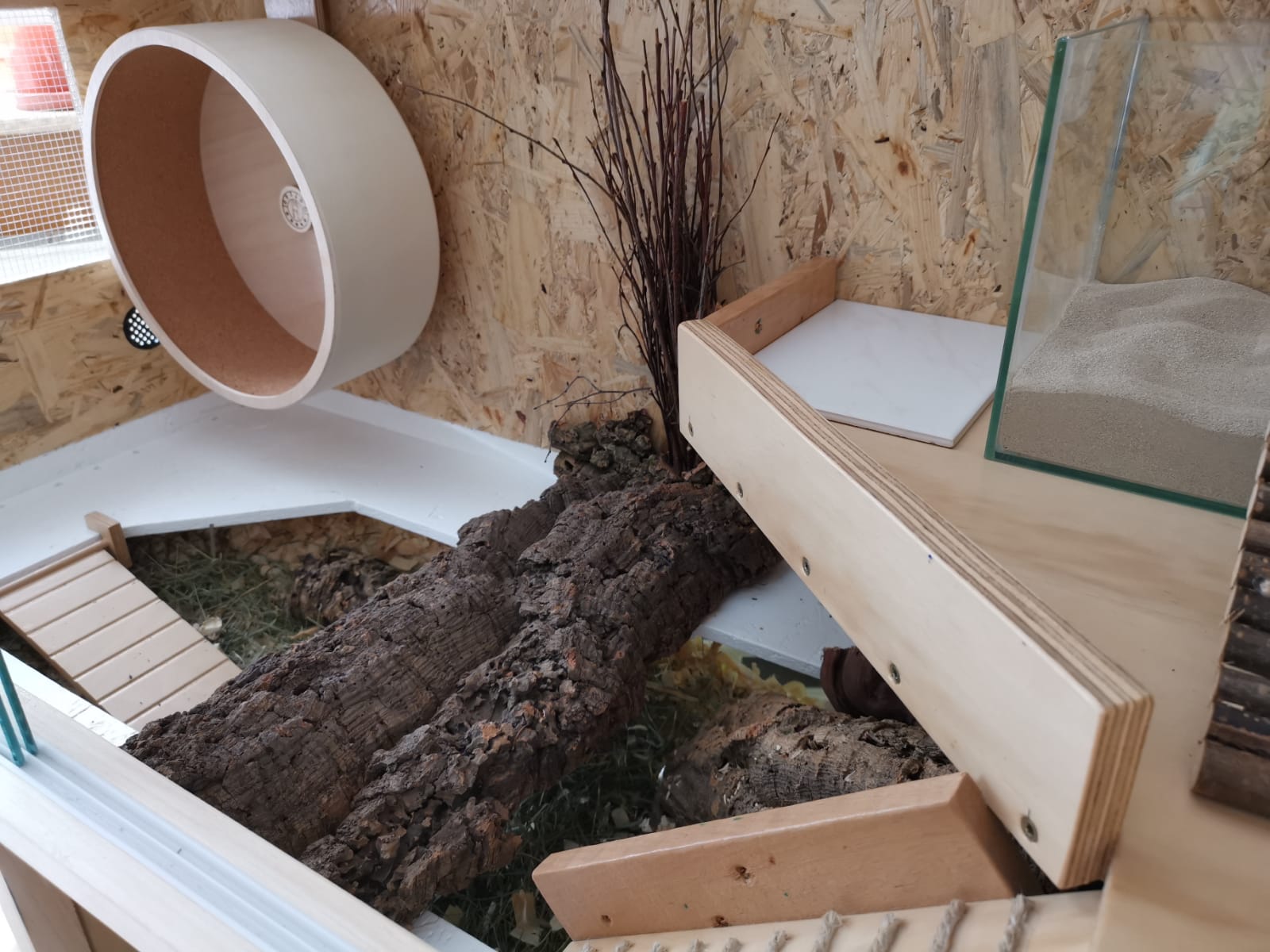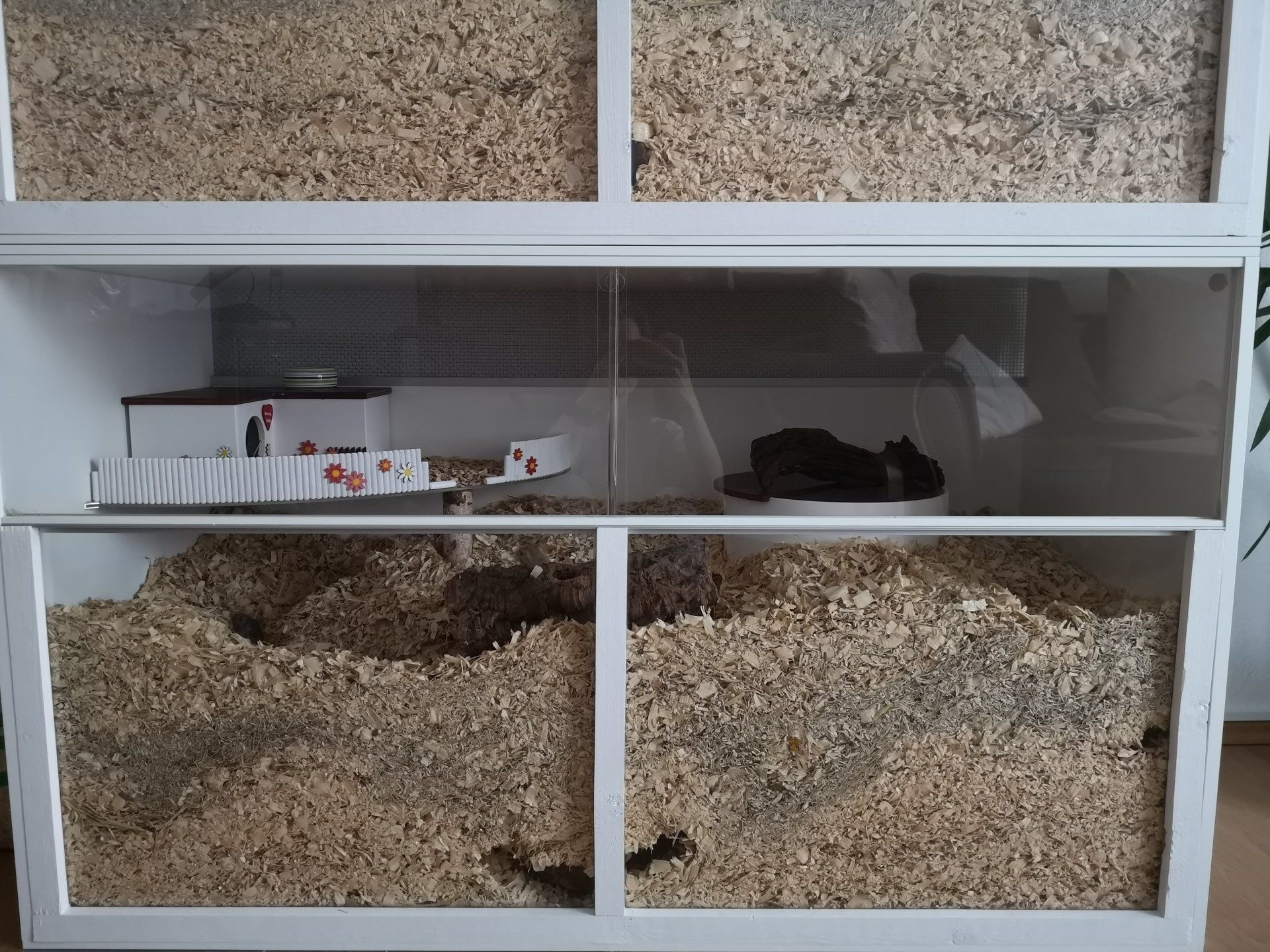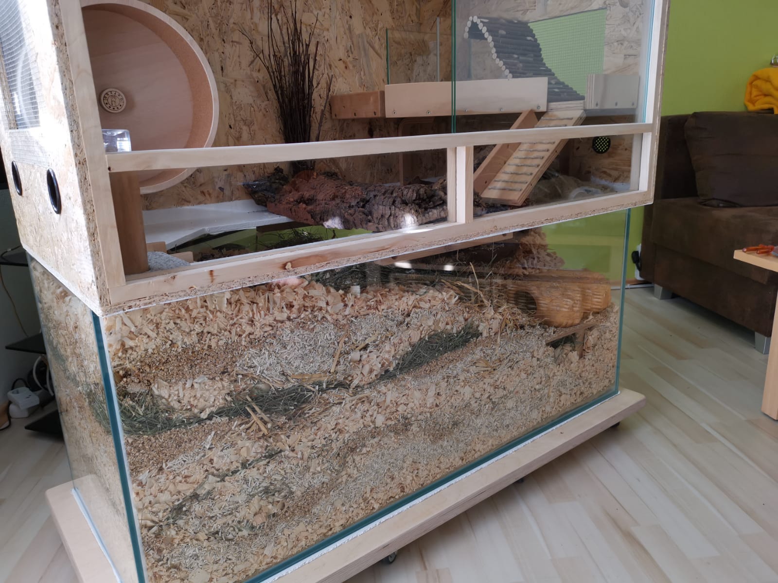 Hier wurde ein alter Schrank sämtlicher Trennwände beraubt, um einen großen durchgängigen Buddelbereich entstehen zu lassen. Der Boden des OSB Terrariums wurde in der Größe des Schrankes VOLLSTÄNDIG ausgeschnitten, um einen nahtlosen Übergang zwischen Buddelbereich und Aufsatz zu bieten. Die Ebene ist an jedem Punkt begehbar :)
