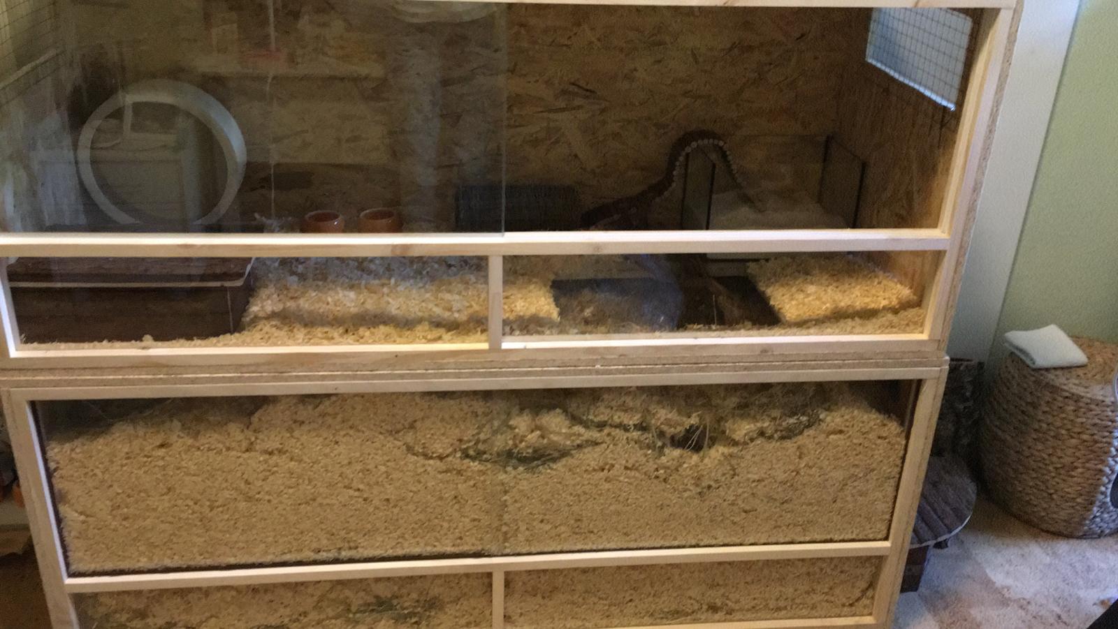 Die Firma "Nagerterra" bietet artgerechte und sehr praktische Gehege nach Maß und Wunsch an. Hier kann die Größe des Geheges, sowie die Höhe der Streukanten in der Front und an den Seiten selbst gewählt werden. Das Höhenkonzept eines Aquarium-Aufsatz-Verbundes kann also in einem Gehege ( Höhe von 70-75cm) ideal umgesetzt werden. Zusätzlich sind die Gehege Zahnfest und die melaminbeschichteten Spanplatten können sehr einfach gereinigt werden, und bieten Ungeziefer keinen Halt.