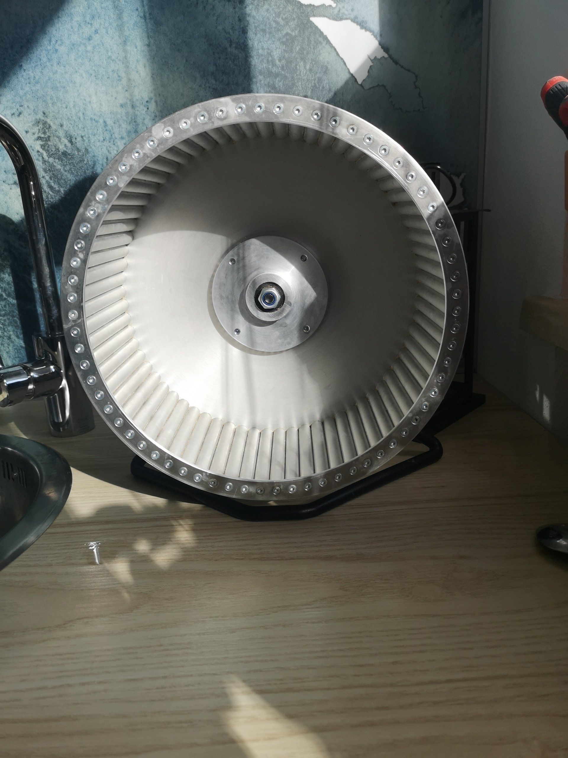 Laufradschmiede (Bild: Vollalu, 28cm Durchmesser) kommen z.B. mit einer Achsenbefestigung für die Rückwand des Geheges, oder mit einem sehr stabilen schweren Standfuß. Auch eine spezielle Aufhängung für die Decke gibt es für diese Räder.